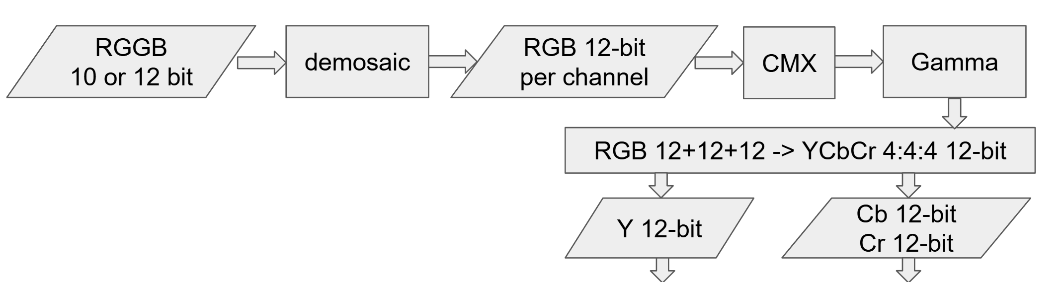 At this stage of the imaging pipeline the pixel data is represented in full-range RGB color space with 12-bit precision per component, as produced by the CMX stage (gen5-cmx).
